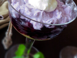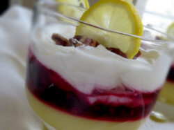 The first dessert on the left starts with one of the best lemon meringue pie fillings I’ve ever had. It is an old recipe from my maternal Grandmother that she got from high school in the 30’s. It is smooth and rich and just right. I topped it with some blackberry compote that I made quickly from thawing some summer berries I had in the freezer, (You know, for when I needed to plop a blackberry into a glass of Prosecco,) added sugar and lemon juice, and cooked for a bit. Then the top is whipped cream with lemon juice, sugar, vanilla and greek yogurt. The three textures are amazing. Topped with a lemon slice rolled in granulated sugar and frozen to keep its shape, and its perfect!