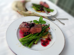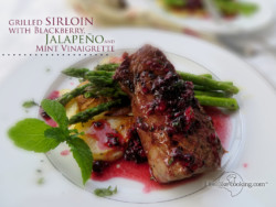I’ve been eating salads all week, as I try to make sure I stay slim for my niece’s wedding next month. But I just couldn’t bear to put another piece of spring mix in my mouth. Yet, I knew these berries would make a fantastic dressing. The answer? Put this lovely, fuchsia emulsion on the steak itself. With a little mint from the garden, a snappy jalapeno, and some honey, I dressed up our plates and made steak and potatoes something worthy of a weekend or company. I even missed rainy Seattle just a little.