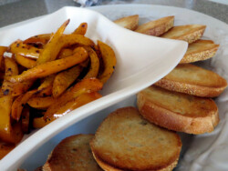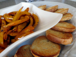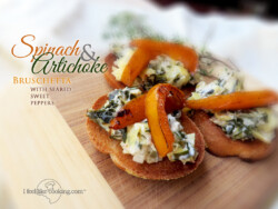 To set it apart, and help add another flavor profile, I seared some beautiful orange sweet pepper spears in lemon juice and red wine vinegar, and dusted them with an ever-so-subtle shower of allspice then gently placed them on top of the dip. With a hint of fresh rosemary and fresh thyme in the dip, each bite simply filled your mouth with soft, buttery, and warm amazingness. I call it my SPINACH AND ARTICHOKE BRUSCHETTA WITH SWEET SPICY PEPPERS.