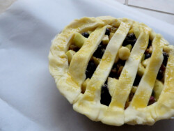 Each went into a small, 6 inch pie plate, and I did fun things with the crust. Bake them each at 375 degrees for about 50 minutes, with foil covering the pie the last 20.