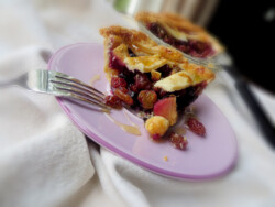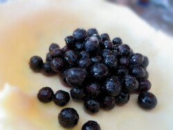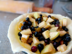 For these pies, I began with a tub of blueberries, about 3 cups. Then added 1/2 C sugar, zest from a lemon and about 2 T of fresh grated ginger. I took about a third of the blueberries and then added a cut up Fuji apple, and a handful of golden raisins, and then a scant 1/4 t of allspice and that became the second pie. (see photos below)