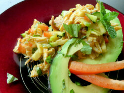Here’s what I know. Once you remove that cute little round pit, that center is so inviting; so perfect and so convenient that it simply begs to be filled with yumminess…so that’s what I did. Taking the tender cold chicken from the bones of my leftover rotisserie chicken, I created a spicy, tender chicken salad that worked perfectly with the soft, butter flesh of the avocado. Try my RED CURRY AND BASIL CHICKEN SALAD AVOCADO BOATS today. It’s the perfect summer dinner! #avocado #chickensalad #caminecooks #stuffedfood #summerdinners