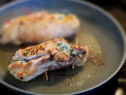 As time went on, I found other items with a center that drew me in. Pigs in a blanket, Twinkies, even the ol’ standby, a Monte Cristo. I could name hundreds of foods with a “center” that I have eaten, duplicated, shared or reinvented. But for today, I will share my latest stuffed creation, SPINACH, RICOTTA AND PINE NUT STUFFED PAILLARDS WITH A BUTTERY LEMON CREAM SAUCE. I served a lovely Columbia Crest Pinot Gris with it, and as always, shared it with my gorgeous husband, Ron. He’s cute on the outside and kinda nice on the inside, too! — Check out my recipe which is also #fabin40 and full of deliciousness! #caminecooks