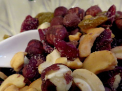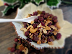 Christmas Trail Mix is brimming with crunch and variety. Simply mix the following together: 1/4 C toasted hazelnuts, 1/4 C salted cashew pieces, 1/4 C each golden raisins and craisins, then add semi-sweet chocolate pieces to your taste. Add a little more coarse sea salt, some pepper, a touch of sugar, a bit of coriander and some cinnamon. Stir and set out with your favorite hand snacks!