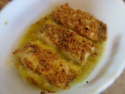 So here’s the gist. Flaky, moist cod is crusted with crushed, salted peanuts, a bit of curry powder, ginger powder, cumin and salt and pepper and baked in a 400 degree oven. The green beans were sauteed with stock and balsamic along with some raisins and apricots, and it was all served on a bed of fluffy rustic mashed potatoes that were just white potatoes boiled, then rough mashed with a fork with butter, cream, and salt and pepper. BAM! Download the recipe for the main and side dish and you’ll see my step-by-step instructions make it pretty darned easy to dazzle the other fishes in the sea, even when you’re still trying to find your flippers.