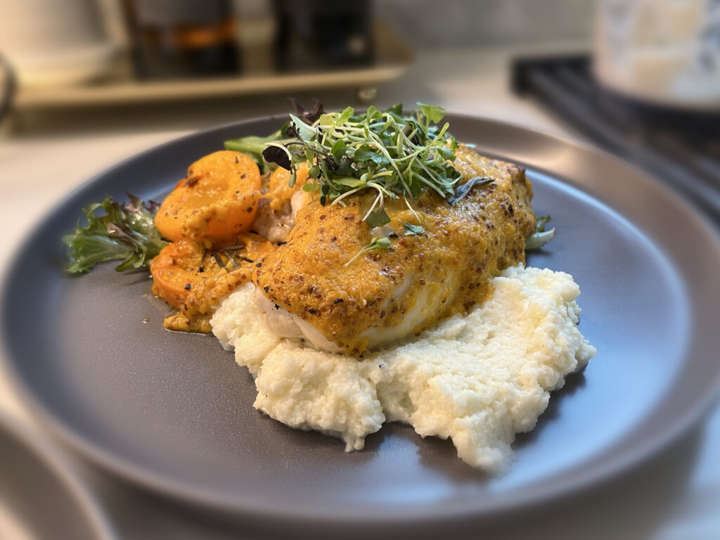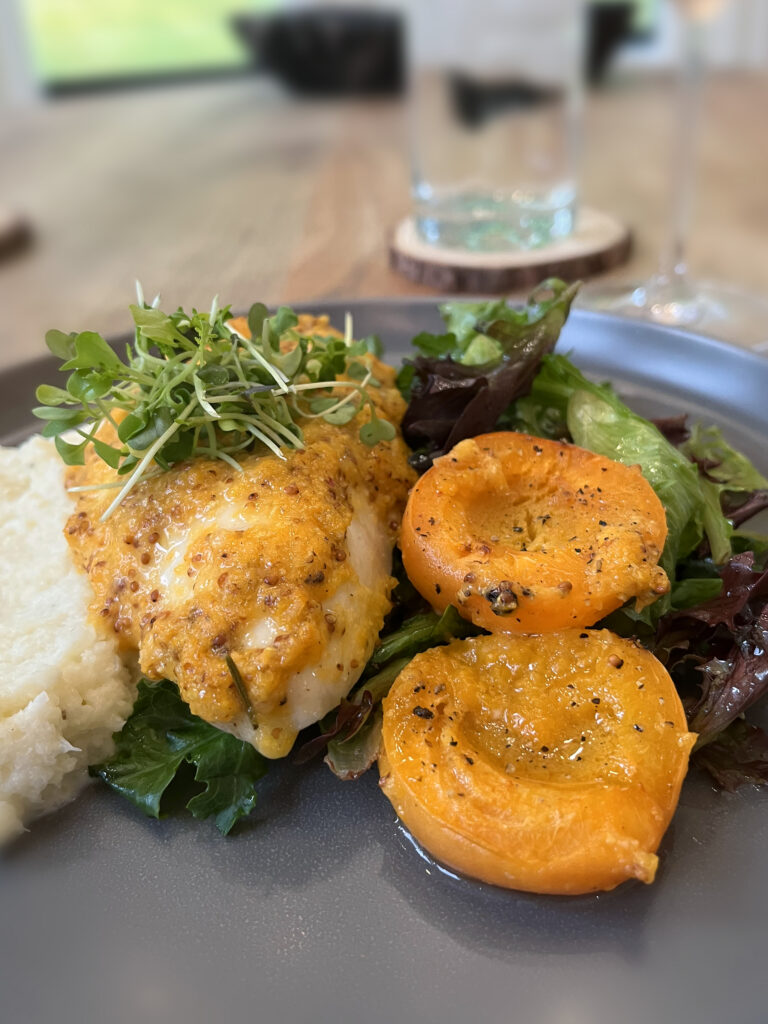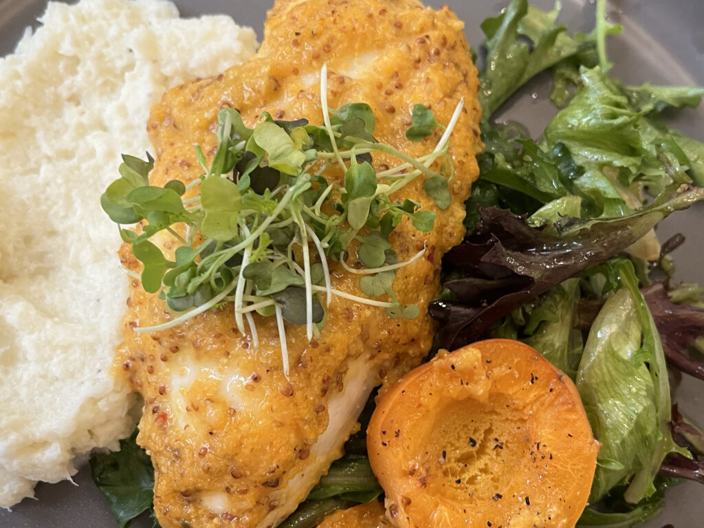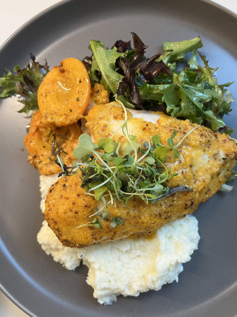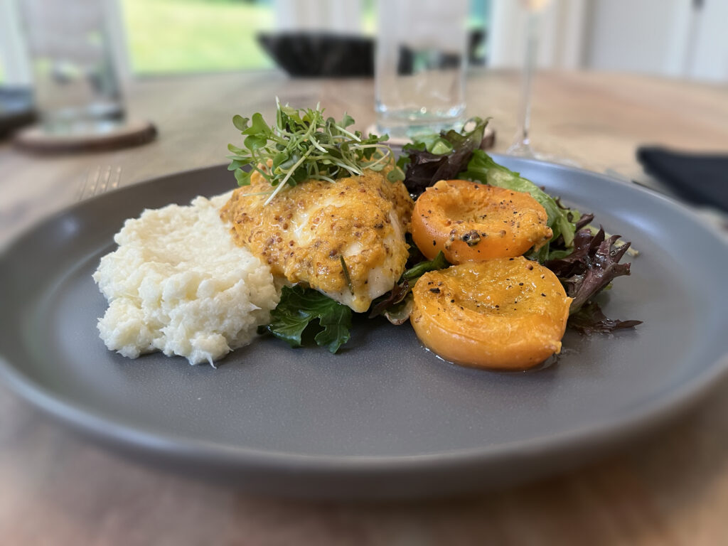 • Serve over mashed cauliflower and top with microgreens and nestle one of the apricot halves next to the chicken for serving.
