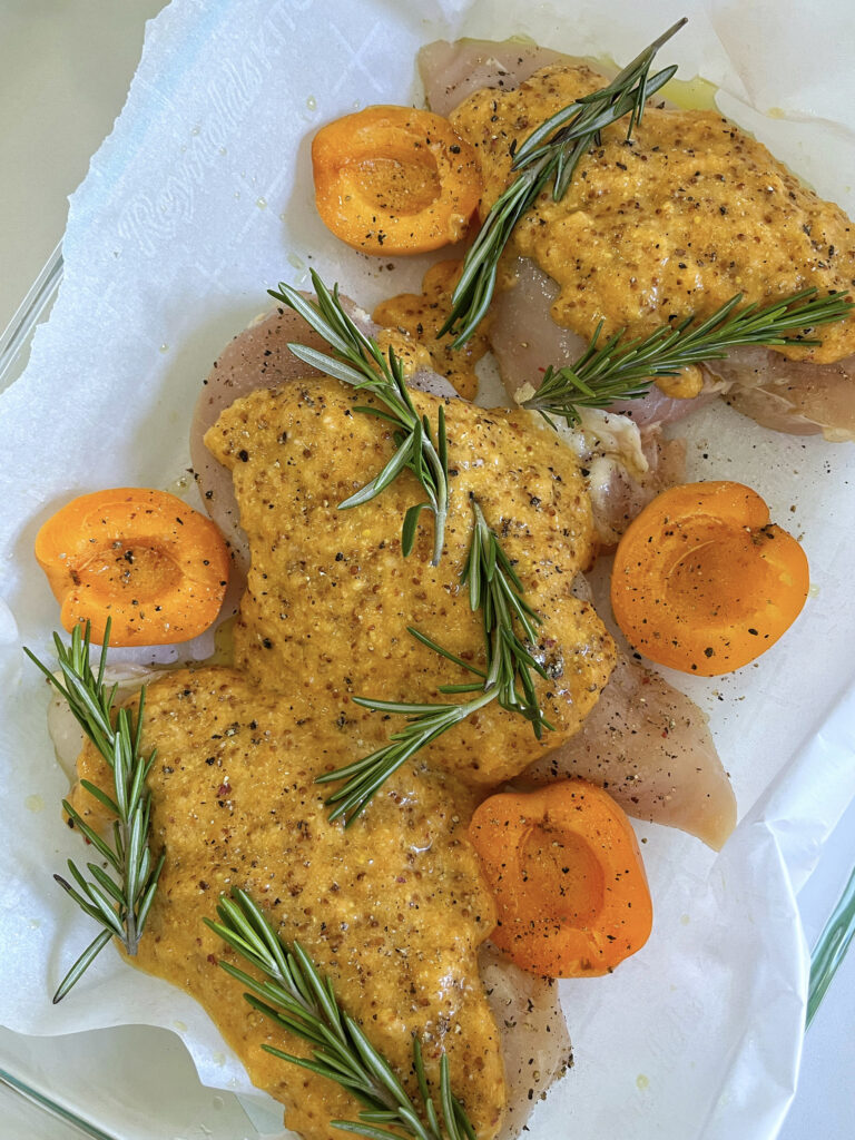 • In a large baking pan lined with parchment arrange each of the chicken pieces and nest in the 4 halves of the apricot you didn’t add to the food processor. Pour the apricot mixture over the chicken and nestle the rosemary sprigs on top making sure the sauce cover the whole top and dribbles over the sides of the chicken. Bake for about 35 minutes or until chicken is done. Do not over cook. Discard rosemary sprigs.