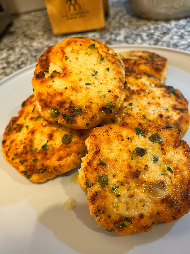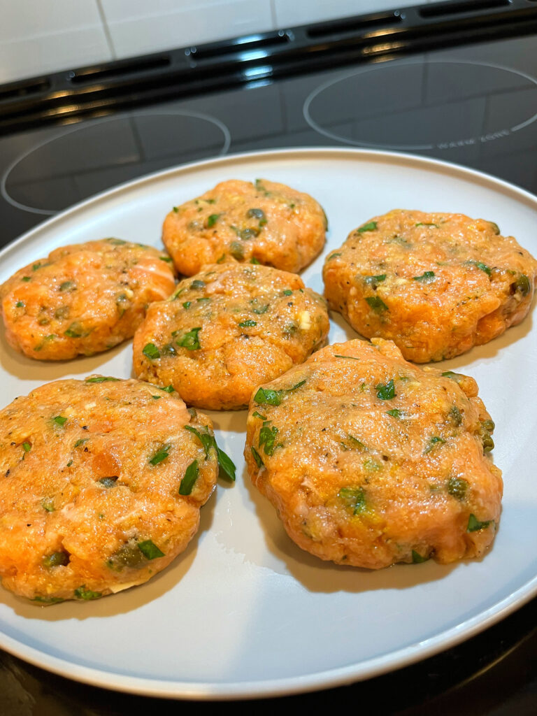 • In a small food processor, add the salmon and blend until chopped, and is the consistency of ground chicken. Add to a large bowl and add ingredients from lemon zest to Seasoning Salute. Blend well with spoon or hands. Form into 6 to 8 small patties.