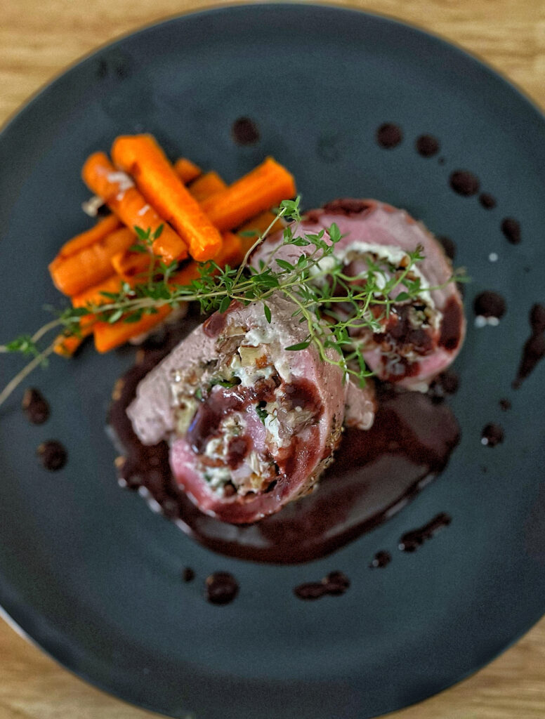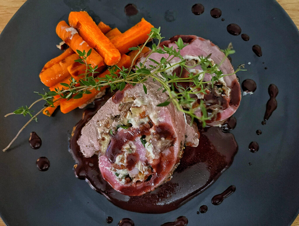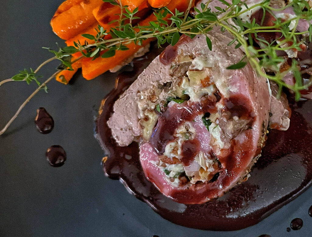 Pecan, Cream Cheese, Nutmeg Stuffed Pork Loin with a Cherry, Cabernet, Maple Reduction