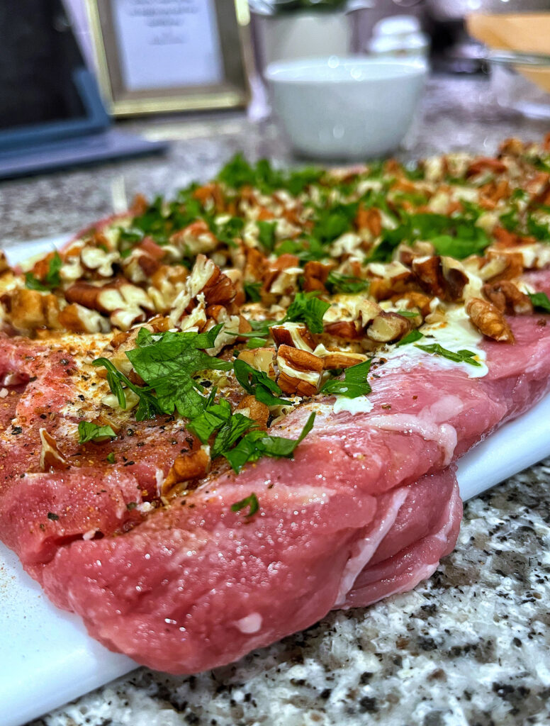 • Begin adding the stuffing by slathering the cream cheese evenly over the surface coming short of the edges by about ½ and inch. Drizzle with olive oil and salt and pepper. Sprinkle all over with the pecan pieces. Sprinkle the nutmeg evenly over the surface and then add the parsley. Covering every surface evenly.