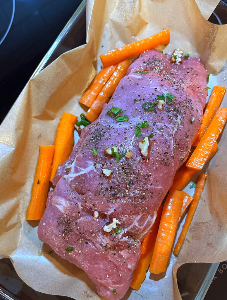 • Roll from the small end and keep a tight roll until you can tuck under the other edge and create a log about 9 inches wide and about 4 inches tall. Place seam side down in a baking dish lined with parchment paper. No need to tie it if your roll is snug. Rub with a bit more olive oil and a some salt and pepper.