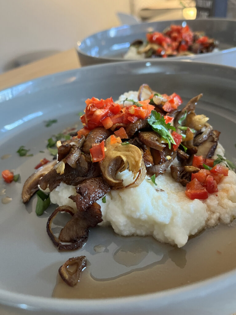 • Sauteed Chestnut Mushrooms over Pureed Cauliflower with Red Pepper Hot Honey Relish