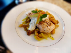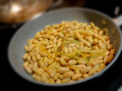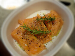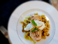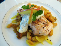 I have to say I am always adding a little of the Indian food pyramid to almost everything I make. Which is why my SALMON WITH MINT ROSEMARY RAITA OVER WHITE BEANS SAUTEED WITH CUMIN, RAISINS AND ONIONS TOPPED WITH HONEY LEMON APPLES came out needing such a long title! I dunno if its Indian, but it feels like it. Each bite was so full of flavor, so nuanced, I scribbled not only the recipe but every detail I could remember about how I was inspired to make it.