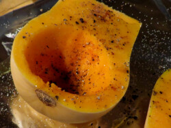 Rinse the gourd. Cut it in half, then half lengthwise. Scoop out the seeds with a spoon. Cover a roasting sheet with foil and place squash on foil. Drizzle about 1/2 T oil on each upper facing half. Cover with Salt and Pepper and a smidgeon of allspice. Roast in a 375 degree oven for 40 minutes or so. Remove and devour!