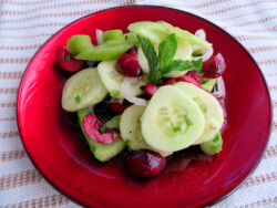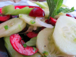 To start with, I knew I wanted to add a little heat to the mix, so out came the jalapenos and some white onion. My mint beckoned next for flavor and a garnish. The cherries always look good against something green and crisp so I pulled out the celery and a nice firm cucumber. You’ll find that each of these flavors meld very well and each bite is refreshing and acidic with a hint of sweetness. I was pleased that nothing overpowered any other flavor and it might benefit from a pinch of ground coriander or a sprinkling of sesame seeds. In any event. This was a winner.