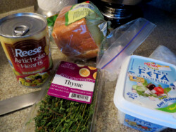 I had such fantastic success with my rum raisin bread pudding that I got to thinking I should create a savory version. Knowing it is mostly bread and eggs, the start of every breakfast, I just turned every thing un-sugary, even adding a kick with a sprinkling of chili flakes, which elevated all the flavors. With the bite of feta, the tang of artichoke hearts, the fresh thyme and crusty exterior, the dish WORKS. I recommend you cover it with crumbled bacon and sour cream, or my personal naughty covering: hollandaise sauce. So what if I can’t sleep. At least eating is fun!