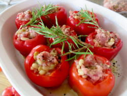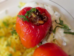 Take this meal. I took ground lamb, added pine nuts, mint, raisins, garlic, and rosemary and stuffed it into these adorable and sweet mini red peppers and baked it until soft and fragrant. Alongside these ruby gems I served a jasmine rice braised with dried apricots, onion, jalapeno, garlic and of course cumin, coriander, tumeric and thyme. The salad was a simple butter lettuce with yellow tomatoes, and a lemon vinaigrette, and it all sat on a bed of cucumber, cilantro, mint yogurt sauce. Holy spices, Batman, this was sooooo good.
