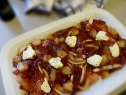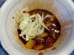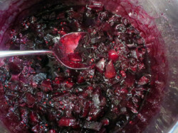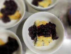 So, while my daughter and one of our friends spent the day viewing Lake shore Drive from the top of the Hancock building, Kaitlyn and I were busy chopping apples, slicing pears, and generally furrowing through every ingredient in the pantry as we created our meal. And did we ever have fun! Discovering a jar of Cherry Salsa, we found the sauce to be spicy and perfectly fruity. By pairing it with canned pears, maple syrup, and some sliced onions, the chicken was on its way to being famous. Then we reduced leftover fruit and sugar down into a luxurious and colorful compote to layer over blueberry scones before topping it all with whipped cream. To round out the meal, we simply took a bag of quality frozen vegetable medley, cooked and drained it, and then added an easy apple cider vinaigrette for a warm vegetable salad.