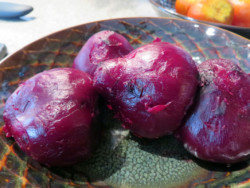 Washing a fresh beet and the long leafy stalk is like laundering the great, purple train of an exotic European costume. The graceful greens are variegated and intensely patterned. Their texture, soft and velvety. At the end is this beautiful claret pearl whose shape is somewhat reminiscent of the clever swirl at the top of a Dairy Queen soft serve with the tendril at the end extending several inches outward, as though its search for water was insatiable. I almost hated to cut it off. But even better rewards were in store.