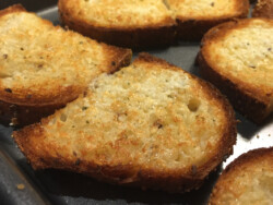 In closing, you will see that I also made some very yummy cheese bruschetta. Just brush on lots of butter mixed with Romano cheese, broil, sprinkle with kosher salt and fight over them! (I mean serve.)